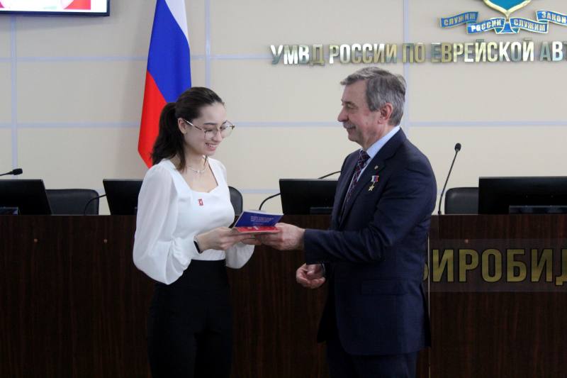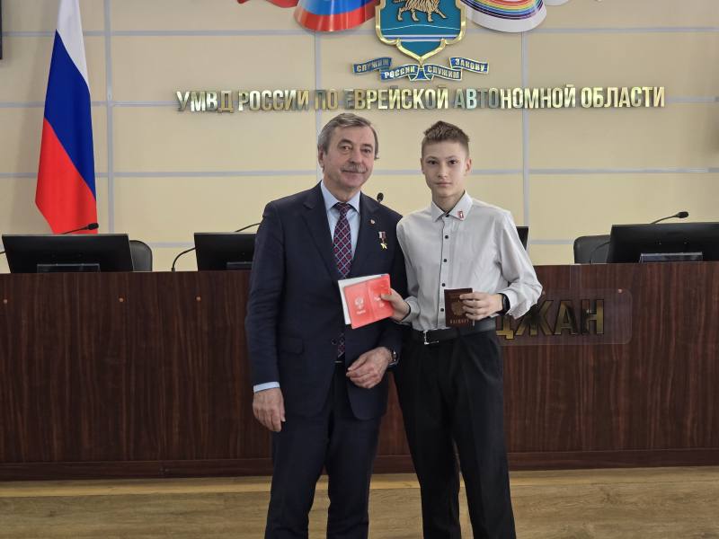 В УМВД России по ЕАО космонавт, Герой России Александр Лазуткин вручил юным биробиджанцам первые паспорта
