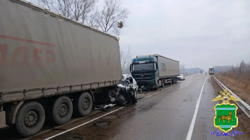 По предварительным данным, 16.04.2026 в 12 часов 50 минут в районе 1993 км 100 м ФАД «Чита-Хабаровск» Биробиджанского района, водитель (мужчина 46-ти лет) автомобиля «Ниссан X-TRAIL» не правильно выбрал дистанцию до впереди движущегося транспортного средства, результате чего совершил столкновение с автомобилем «DONGFENG». После чего водитель автомобилz «SANY» с прицепом, двигавшийся в том же направлении, также не правильно выбрал дистанцию до впереди едущего транспортного средства и совершил столкновение с автомобилем «Ниссан X-TRAIL». В результате ДТП водитель легкового автомобиля от полученных травм скончался на месте до приезда скорой помощи, пассажир авто «Ниссан X-TRAIL» (женщина 40 лет) получила телесные повреждения.