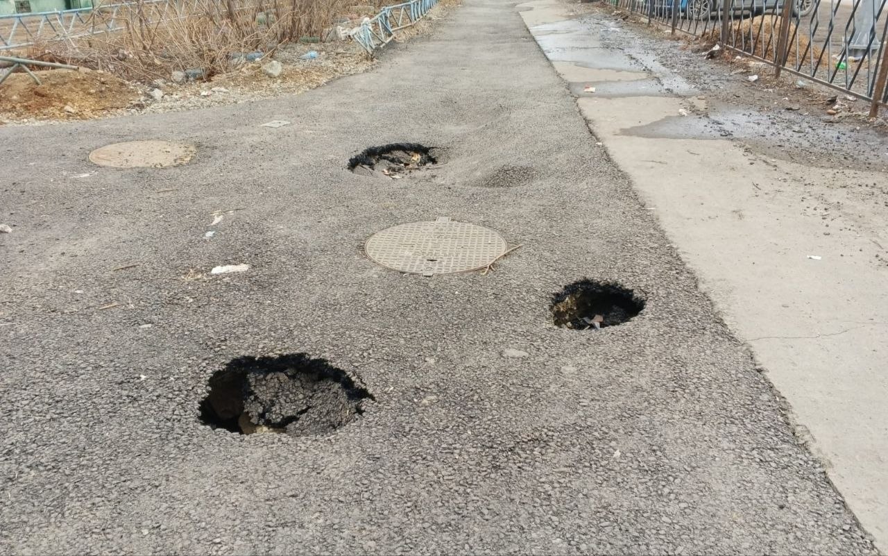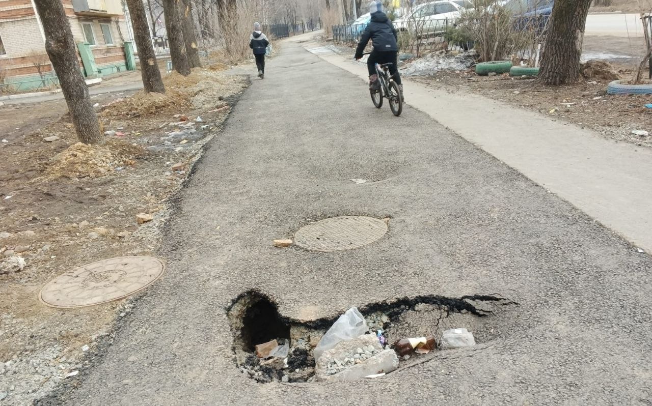 Так выглядит «новая» тротуарная дорожка в микрорайоне Сопка города Биробиджана. Местные жители рассказали, что асфальт здесь уложили в конце прошлого года. Зиму это покрытие, как видно, не пережило.