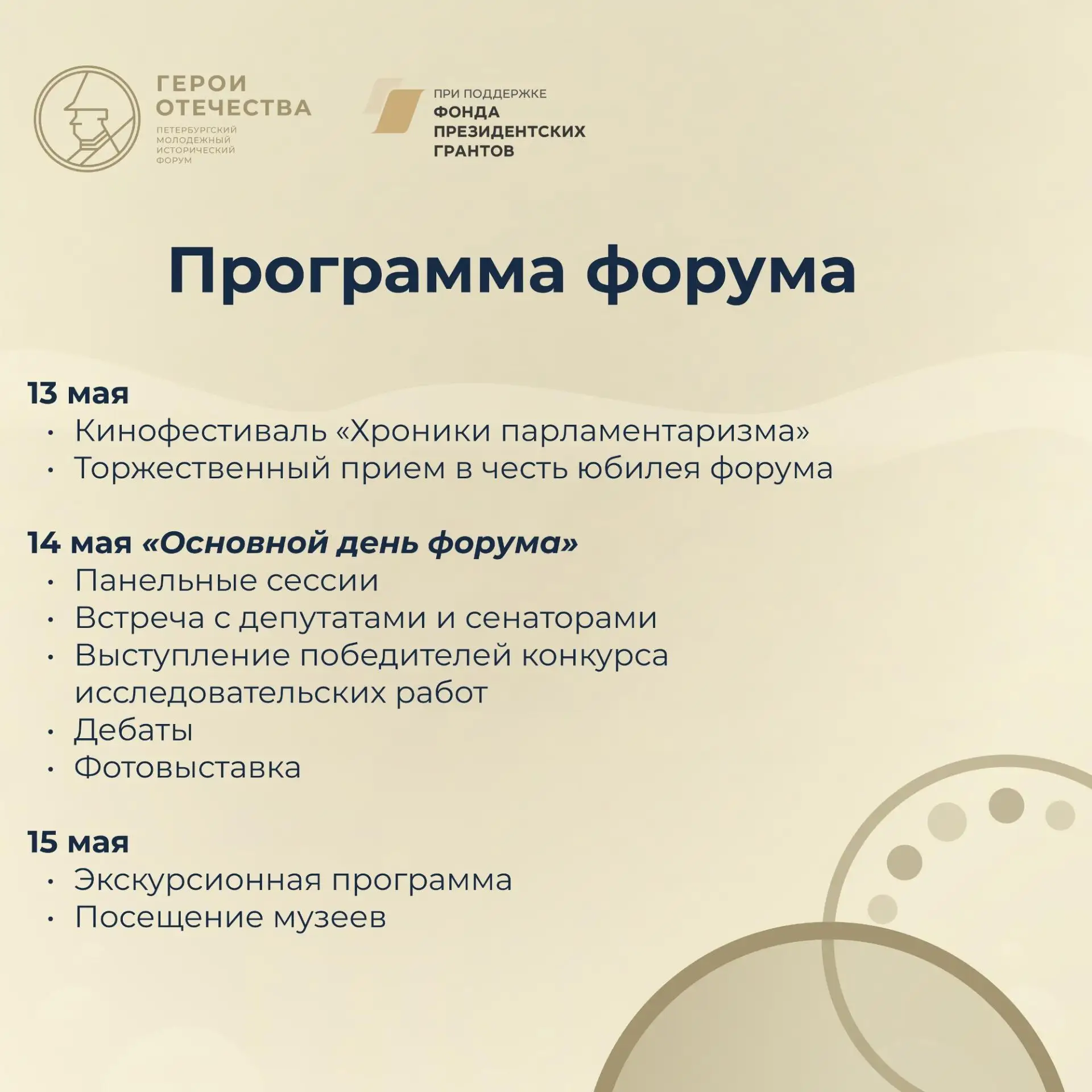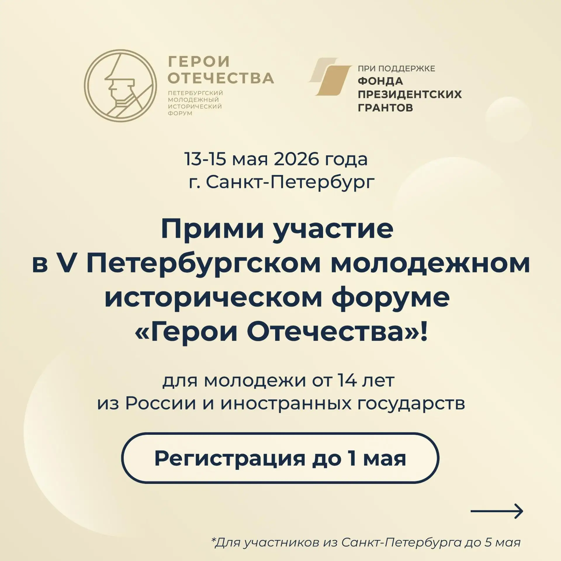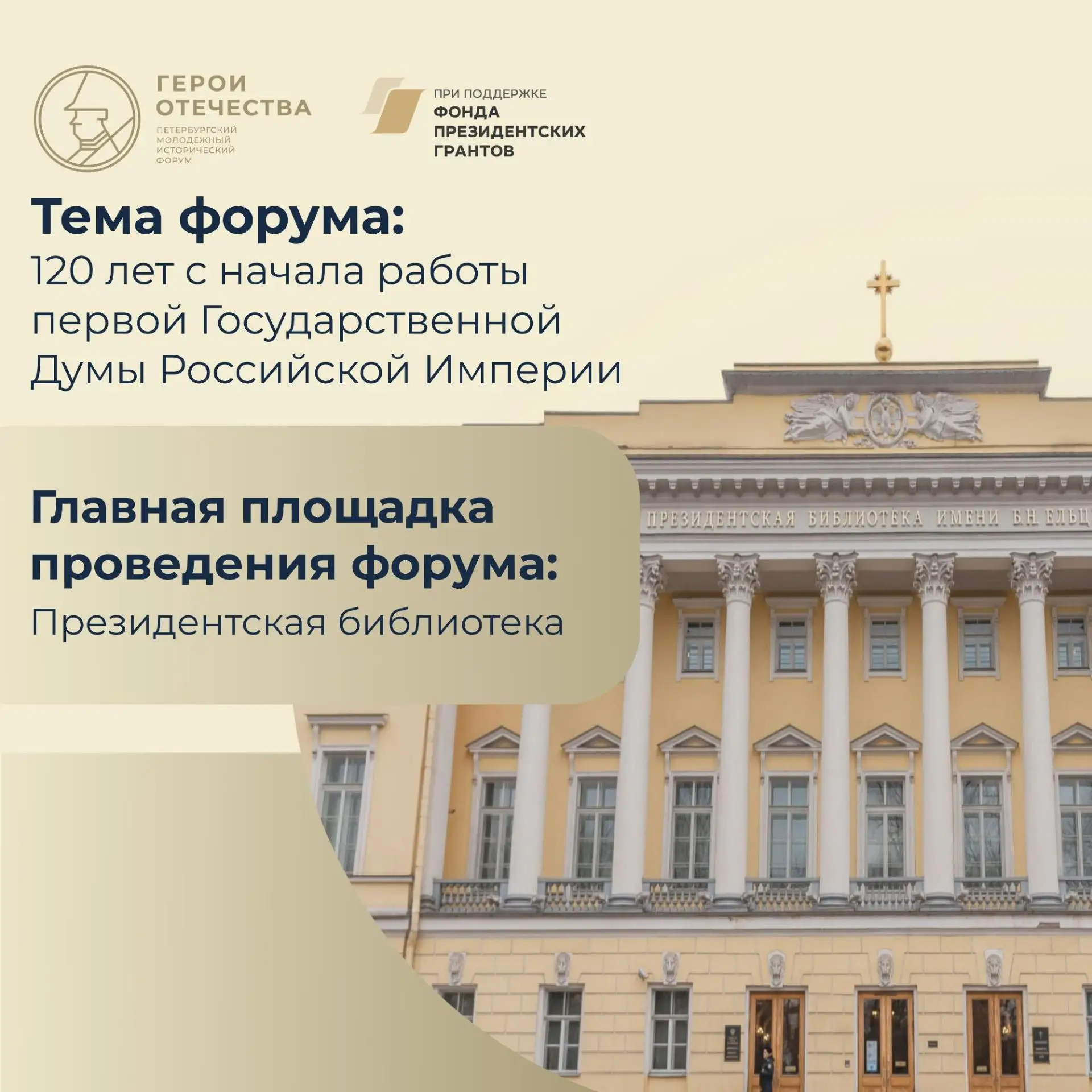 С 13 по 15 мая года в Санкт-Петербурге пройдет V Петербургский молодежный исторический форум «Герои Отечества». Основной площадкой проведения Форума станет Президентская библиотека, а также другие культурные и исторические площадки города на Неве.