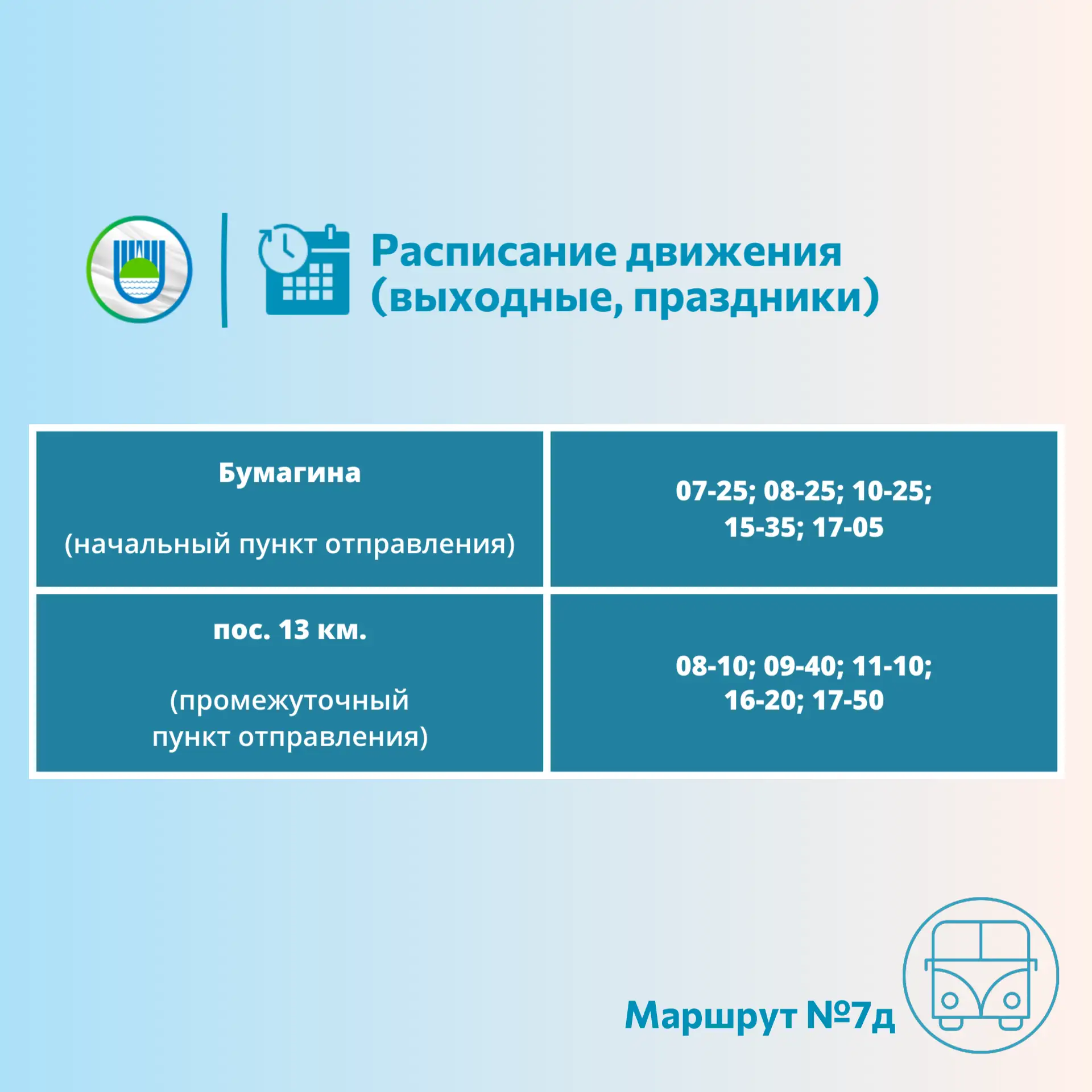 С 18 апреля дачный маршрут №7д возобновил свою работу. До 11 мая автобус будет ходить по выходным и праздничным дням, а потом перевозки будут осуществляться ежедневно.