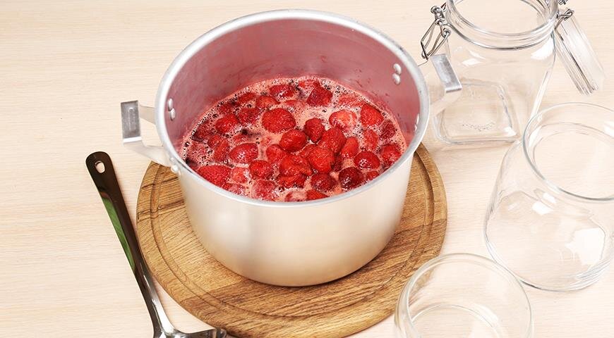 Для классического рецепта требуется соотношение ягод и сахара 1:1. В большую кастрюлю наливается вода слоем около 1 см, затем аккуратно посыпается сахаром, после чего добавляются ягоды или нарезанные фрукты. Ставить на огонь следует аккуратно, не мешая, а только слегка покачивая кастрюлю. Как только варенье закипит, наступает время действовать: нужно варить на сильном огне, постоянно помешивая и снимая пену, в течение ровно 5 минут. Готовое варенье раскладывается по стерилизованным банкам, плотно закрывается и переворачивается для охлаждения.
