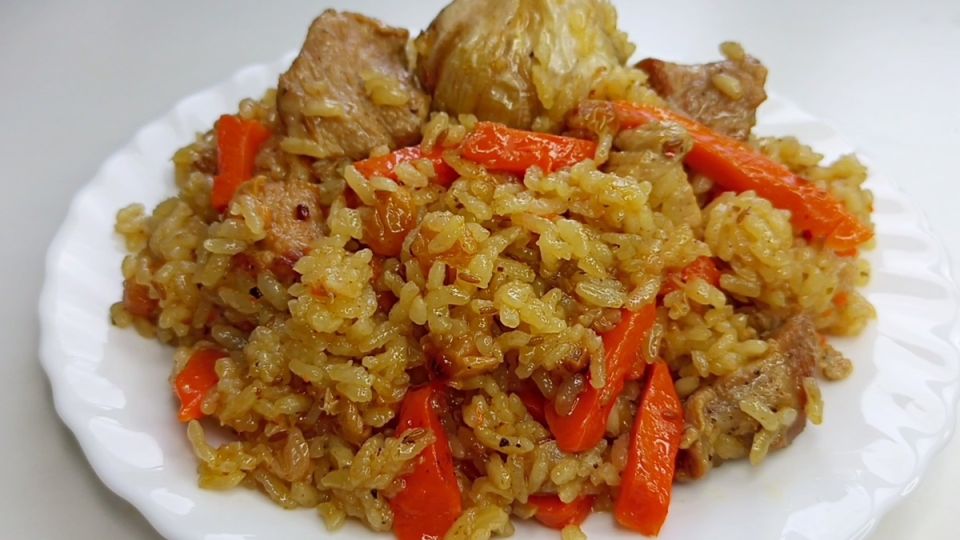 Рис обжаривается до прозрачности, после чего добавляются помидоры и кипяток. Плов варят до полной готовности риса, затем настаивают под крышкой.