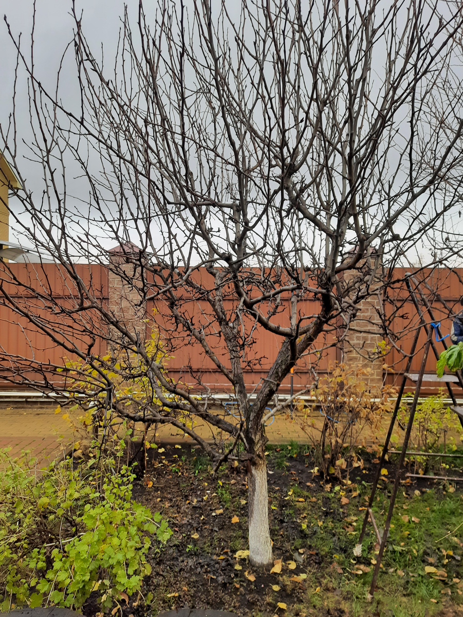 В случае осенней покраски важно учитывать, что ее следует проводить до морозов. Процесс начинается с очистки коры на высоте 1,5-2 метра, а также на основание ствола и развилках скелетных ветвей.