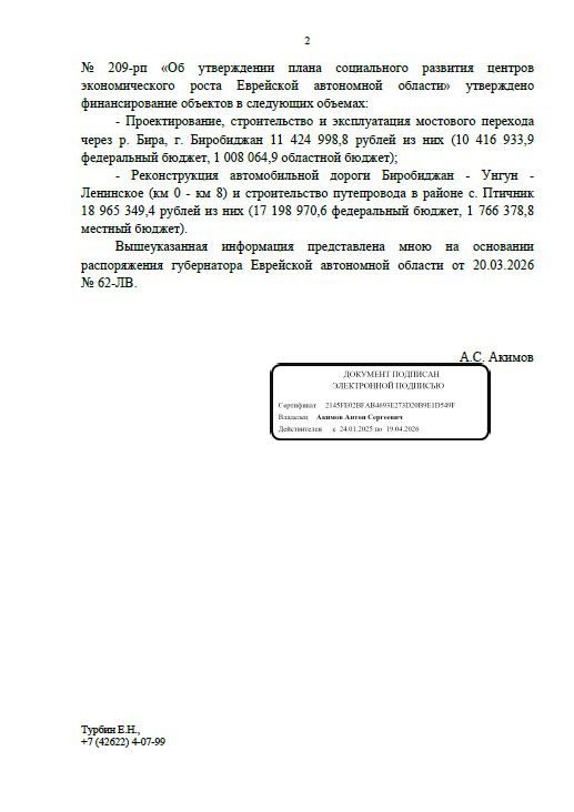 — Реконструкция автомобильной дороги Биробиджан - Унгун - Ленинское (км 0 - км 8) и строительство путепровода в районе с. Птичник 18 965 349,4 рублей из них (17 198 970,6 федеральный бюджет, 1 766 378,8 местный бюджет)», — сообщил Антон Акимов.