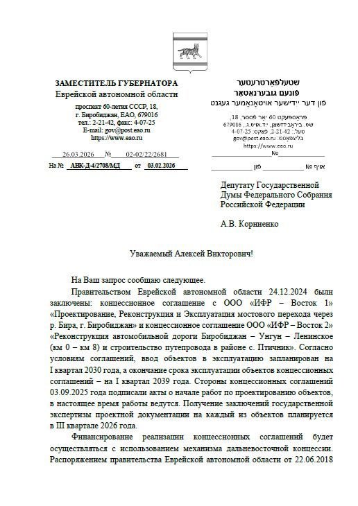 Правительство ЕАО впервые назвало конкретную дату ввода в эксплуатацию масштабных инфраструктурных объектов, которые должны быть построены в Биробиджане в рамках концессионных соглашений, в том числе моста через Биру и путепровода в районе с. Птичник. Информацию по запросу депутата Государственной Думы от КПРФ предоставил заместитель губернатора ЕАО Антон Акимов. Документ имеется в распоряжении интернет-газеты «Набат».