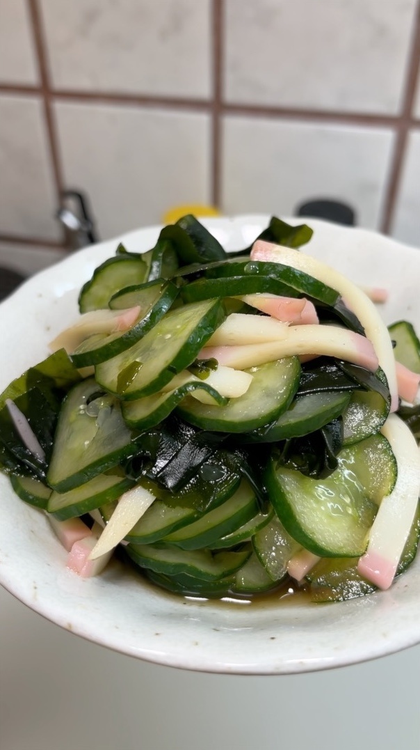 Смешивание: В глубокой чаше соединить водоросли, подготовленный огурец и камабоко. Перемешать все ингредиенты, добавить приготовленную заправку. Накрыть и оставить в холодильнике на 1 час.