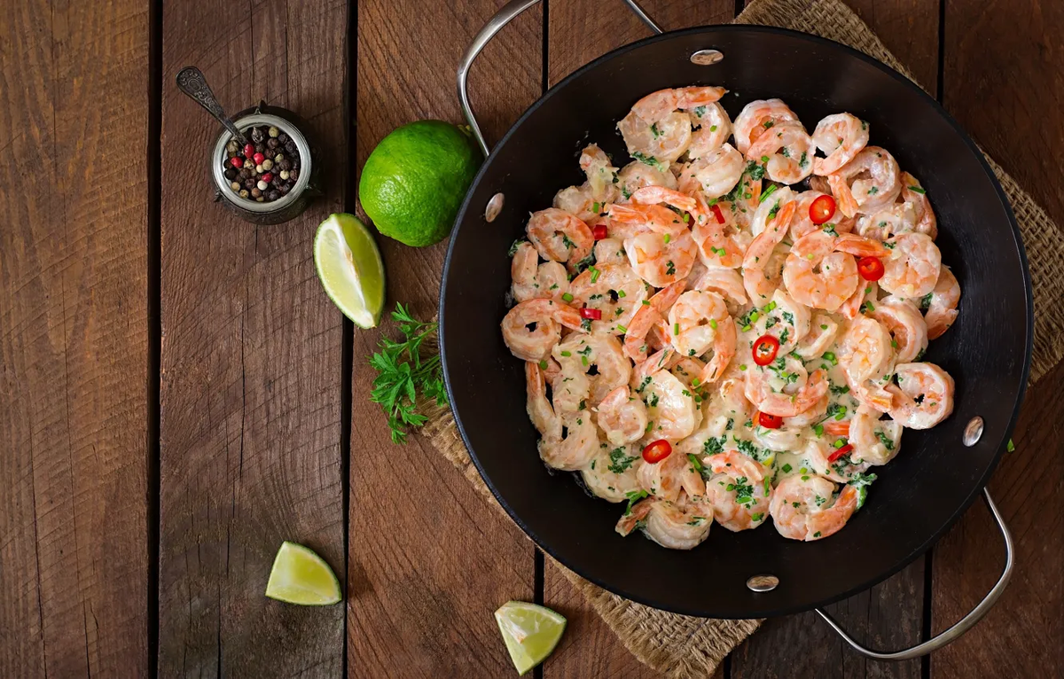 - Обжарьте креветки с чесноком в течение 1-2 минут.