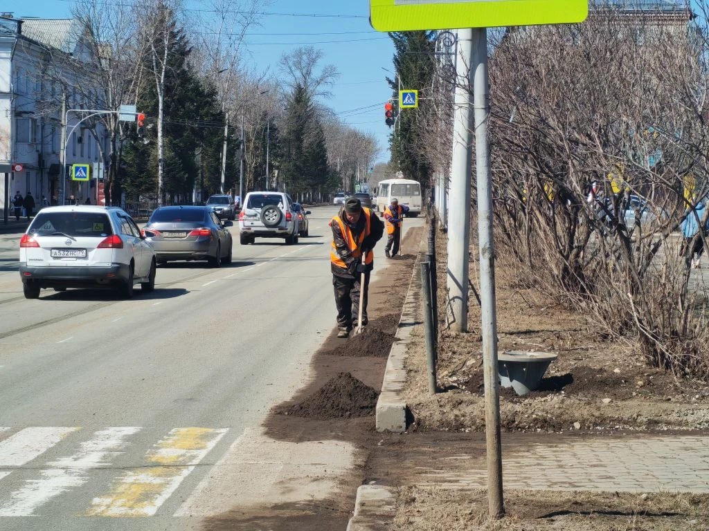 Особое внимание сегодня уделено очистке прибордюрных зон от песка, скопившегося за зиму. На улицах Пионерской и Димитрова двое сотрудников убирают песчаные кучи, которые мешают нормальному оттоку воды и создают грязь. Ещё двое рабочих с тележкой трудятся на улицах Миллера и Калинина, также занимаясь вывозом песка.