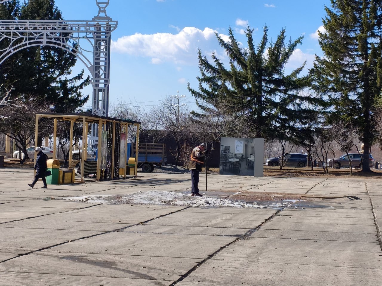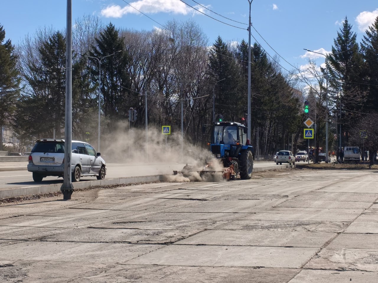 Особое внимание уделяется очистке прибордюрных зон от песка, скопившегося за зиму. Двое сотрудников с тележкой и трактором МТЗ работают на улицах Миллера, Чапаева и Калинина — здесь убирают песок, чтобы дороги стали чище, а талая вода могла беспрепятственно уходить в ливнёвки.