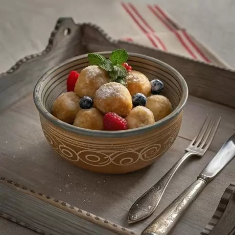 Сырники обжариваются до золотистой корочки и подаются с ягодными «полосками», которые напомнят о флаге страны.