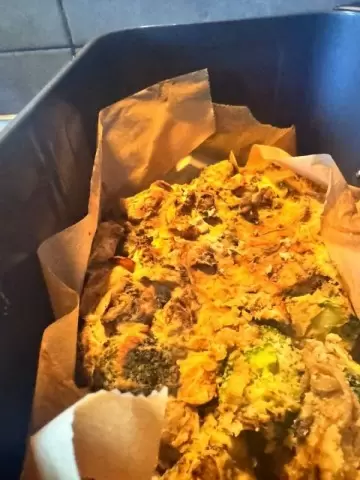 3. Спортивно вдвиньте мясо с овощами в тесто и перемешайте. Разогрейте аэрогриль до 160°C и отправьте пирог готовиться около 40 минут. Если вы решите увеличивать количество теста, время выпекания стоит соответственно продлить.