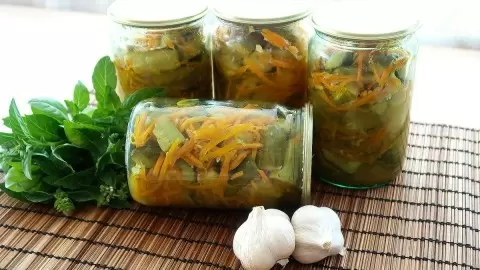 Сначала огурцы следует тщательно вымыть и нарезать. Кончики плодов лучше отрезать для избавления от горечи. Морковь также очищают и натирают на крупной терке. Для приготовления маринада смешивают воду, соль и сахар до полного растворения. Затем добавляют специи, уксус и растительное масло.