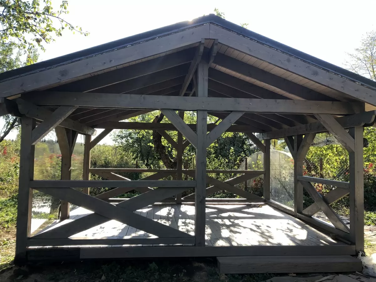Выбор крыши оказался удачным: решили остановиться на металлочерепице, что сэкономило время и усилия. Крепление конструкции вызвало восхищение у всех — легкая, но надежная крыша надежно защитит от непогоды. Подбор цвета для деревянных частей беседки также стал важным моментом: был выбран оттенок "Северный олень", который идеально вписывался в окружающий пейзаж.