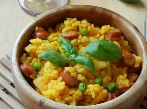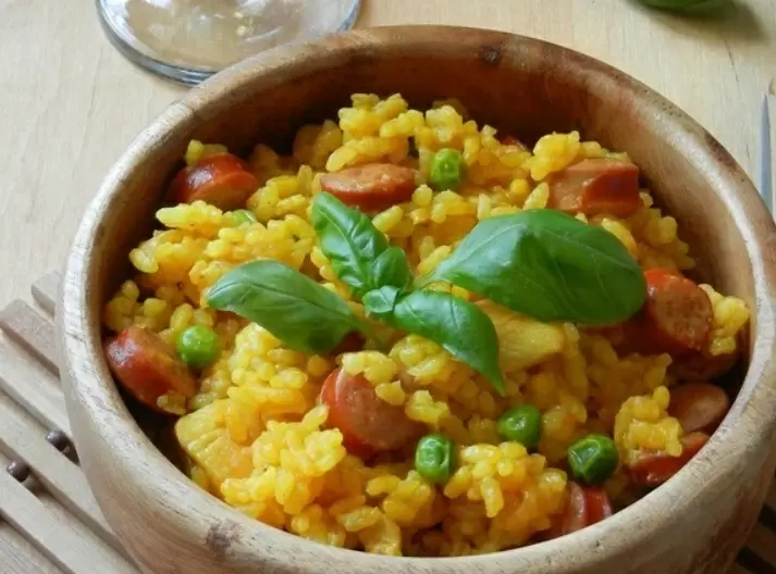 Далее в сковороду вводятся нарезанные колбаски, за ними следует томатный сок. К смеси добавляется 700 мл воды, и всё доводится до кипения. Укладывается рис, а затем посыпаются соль, перец и куркума. Главное — тщательно перемешать ингредиенты и накрыть сковороду крышкой для тушения на среднем огне. Если необходимо, подливается немного воды до полной готовности риса.