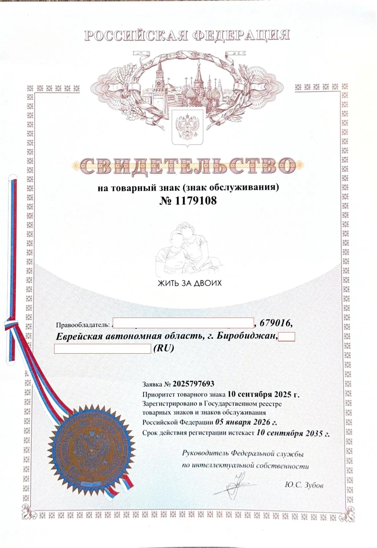 Символ проекта «Жить за двоих» получил регистрацию в Федеральной службе по интеллектуальной собственности. Свидетельство об этом инициатор проекта Полина Ковтун, жена моего сына Андрея, получила на днях.