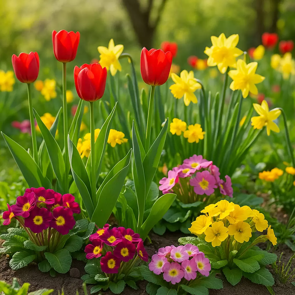 - Весна: тюльпаны, нарциссы, мускари, примулы