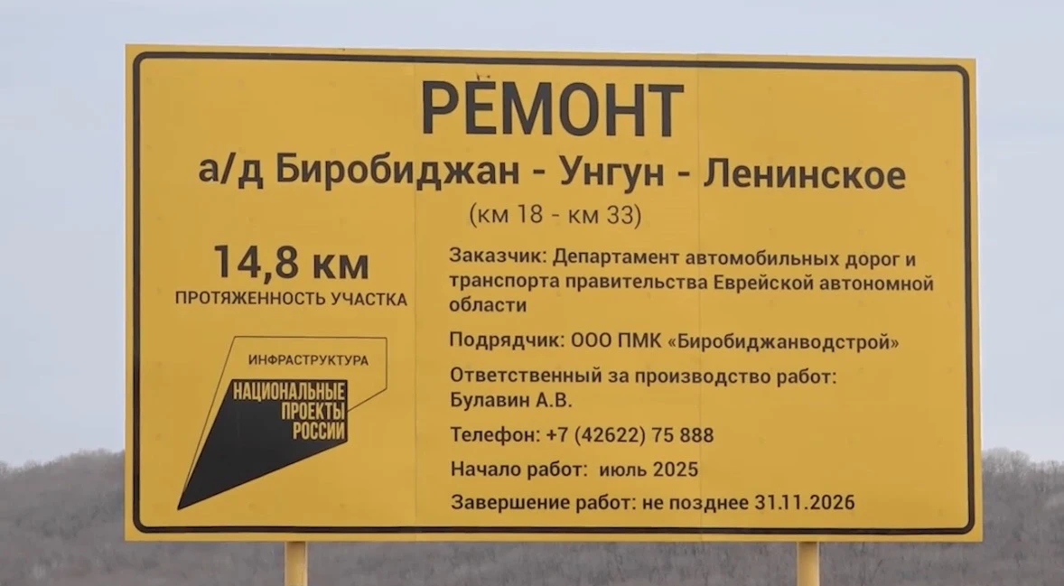 Всего до конца 2026 года на территории Еврейской автономной области в рамках текущих программ запланировано обновление 25 километров дорожного покрытия, включая такие объекты, как: дорога Биробиджан-Амурзет, мост через р. Хинган в г.Облучье, подъезд к международному речному порту в с. Нижнеленинское, ремонт автомобильных дорог ул. Индустриальной, ул. И. Петренко и ул. Дружбы в г. Биробиджане.