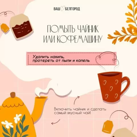 Современные устройства на кухне требуют внимания и регулярного ухода, чтобы избежать накопления накипи и загрязнений. Чайник и кофемашина — это частые любимцы, которые заслуживают особого обслуживания. Рекомендуемое задание на сегодня: позаботьтесь о своих помощниках, приведя их в порядок.