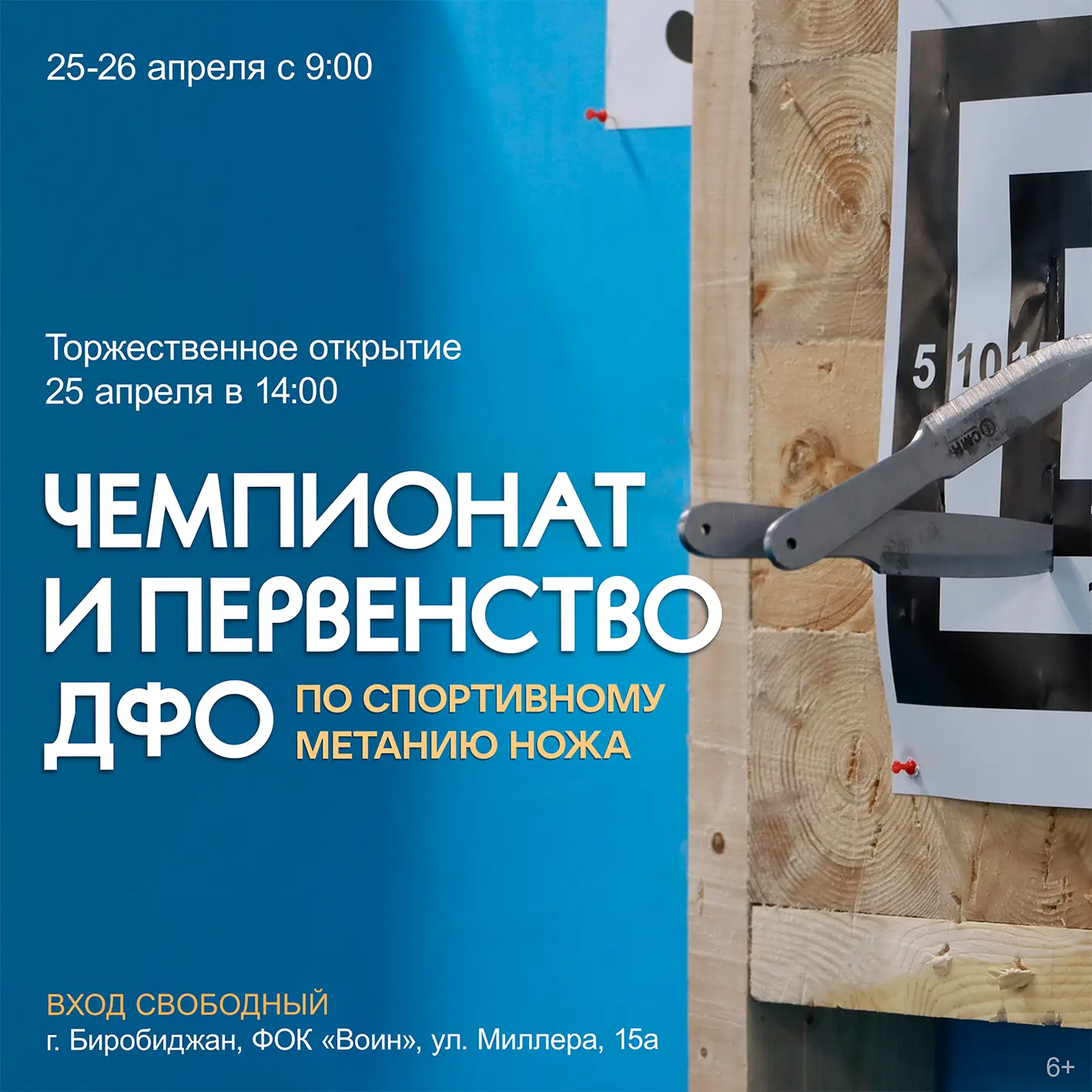 «В рамках реализации проекта «Одна цель» в марте мы уже провели областной чемпионат, в которых приняло участие более 60 человек. Сейчас наши спортсмены упорно готовятся к Чемпионату и Первенству Дальневосточного Федерального округа по спортивному метанию ножа, который пройдет в Биробиджане. Для самых юных во всех районах области нами были проведены мастер-классы, которые, уверен, помогут спортсменам достойно представить регион на соревнованиях. Приглашаем всех желающих 25 и 26 апреля поддержать спортсменов и насладиться турниром!», — отметил автор проекта Сергей Радецкий.