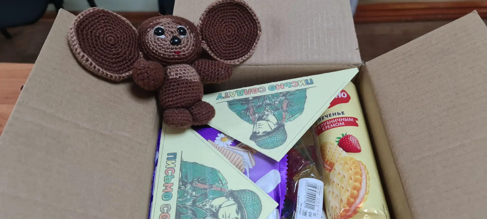 В этот раз в посылке на фронт поедет очаровательный Чебурашка, связанный с любовью. Он проследит, чтобы добрые слова и искренняя поддержка для солдат дошли как можно скорее.
