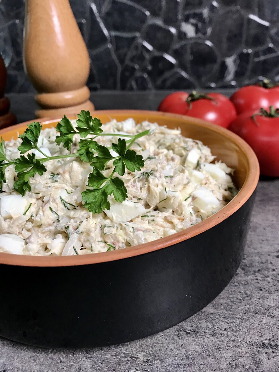 После этого нужно нарезать вареные яйца на небольшие кусочки и добавить их в салат. Затем аккуратно отделите филе скумбрии от кожи и костей и разделите на мелкие кусочки. Добавить рыбу в миску и посолите по вкусу.